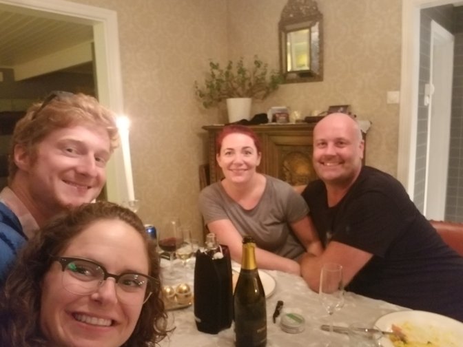 This blog post is getting long, but we made it to Denmark and then to Kristiansandland. Remember how I said you have to be open to new experiences? We just had an awesome couple of days in Kristiansand. Tom, Jane, and Smith the cat hosted us on Couchsurfing, and they were great. They are quite passionate about good food and drinks, and it was really fun getting to learn about the history and culture of Norway from them. (Pictured: Mr. Smith, our furry host).By the way, they are awesome cooks!!! They also make really good beer. Look out for Tom’s IPA to take the upcoming regional brewer’s competition by storm.This deserves a new paragraph because it was so…much…fun. we spent the day touring Kristiansand, and we got to go mushroom foraging in the forest only five minutes drive from their home! We mainly went for chanterelle mushrooms, but it was a bounty of amazing foods! We felt like we were on a Destinations Unknown episode as we walked through the forest with Tom explaining all the different berries, mushrooms, and other plants. We ate fresh apples, blueberries, and hazelnuts as we walked through the forest where they still had existing remnants from the German occupation during WWII.After an enjoyable afternoon, we had to enjoy the spoils of our hunt! Tom cooked up some mushroom and cream sauce with sourdough, and it was really good. It also was really exciting to be able to pick and eat your dinner.The two days we spent there were very enjoyable and recharging, and it just goes to show you if you’re willing to step into an unfamiliar situation sometimes, you could end up with two (three counting Smith) new friends! Thank you for opening your home to us, and we look forward to you coming to the US for Jazz Fest next year! : )