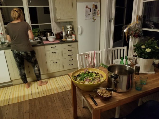 Getting our use of it early on, after two buses and a train, we got to Maria’s pool place in Nacka district east of city center. We were warmly greeted and put to work peeling potatoes for her famous potato salad for her son Kevin’s birthday party the next day. We peeled, drank beer, and discussed her life as a touring musician, love of art, and current events. After all potatoes were peeled and additional magic thrown into the bowl, we got to enjoy the fruits of our labor. I’ve never personally cared for potato salad (I know, I’m a traitor to my southern heritage), but I could get on board with this. Potatoes, olives, onions, dijon, vinegar, and olive oil. I’m definitely going to steal this one for future holiday parties, thanks Maria!