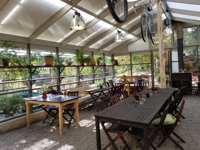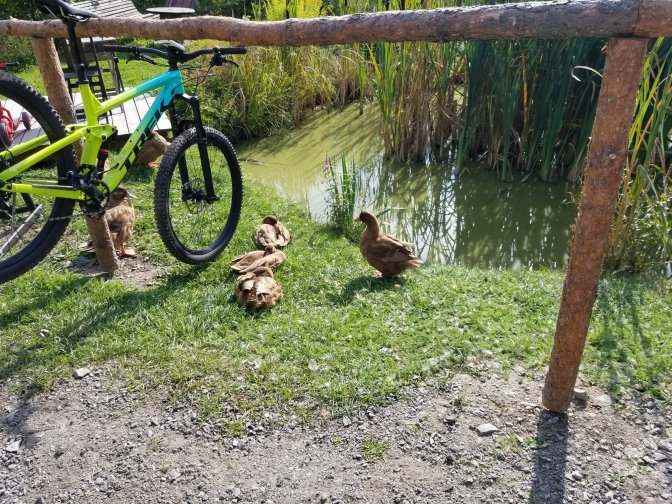 One thing we really enjoyed was a trail-side biking themed coffee shop. This shop was inside of a working greenhouse and was part of a farm on the property. Folks could walk through the gardens, go say hello to the resident ducks, or do some maintenance on their bikes (they even had bike washing stations set up!)