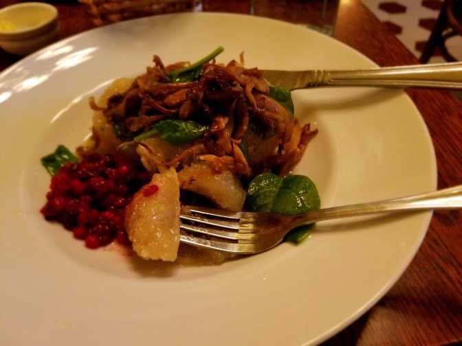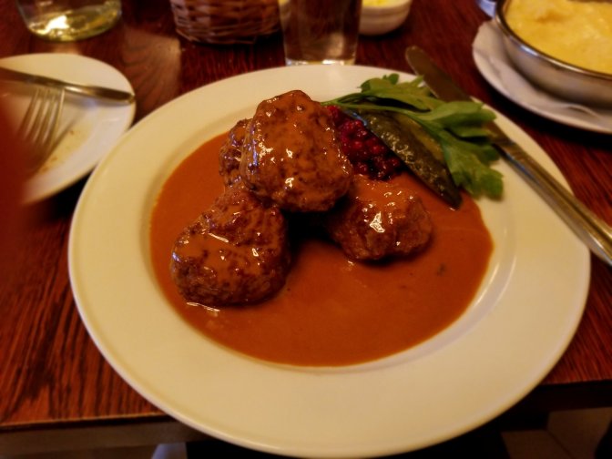 On the way, Morgan specifically wanted to try some Swedish meatballs, so we found a place called Pelikan (once again, food blog theme is forming). I got some sweet potato dumplings filled with mushrooms and lingonberries and spinach on the side. Fo sho going to try to recreate a bastardized version of this at home because this is a holiday meal waiting to happen for veggie-loving folks, and of course the veggie curious types. Ha.