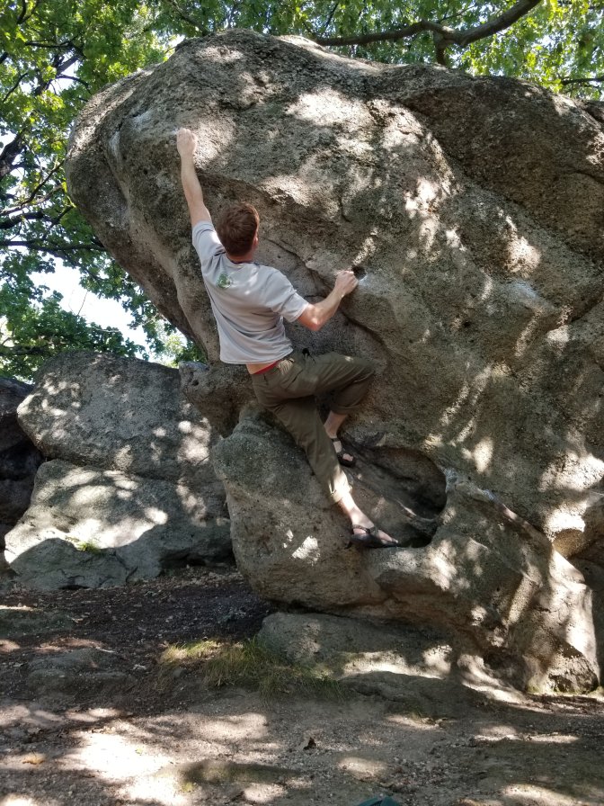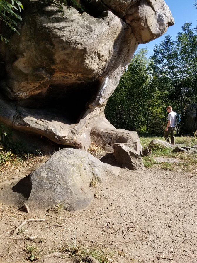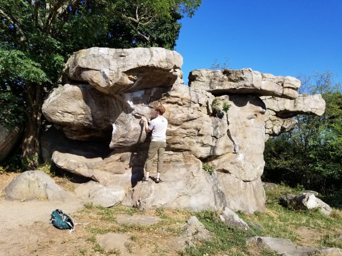 We continued our tour, and we stopped on the outskirts of a small village called Kővágóörs. There is a field containing a sandstone formation that has been eroded away over the years to form unique boulders called the Sea of Stones. Some of the formation still holds water deposits. It felt like we were back in Arkansas walking out to some boulders for some recreation. We came to find out apparently this is a popular bouldering spot. Morgan was excited. Haha