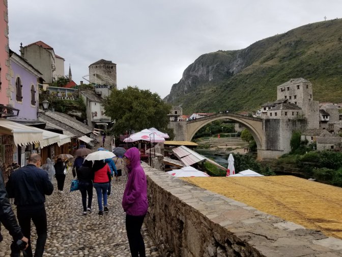 We wanted to get a brief look at the town after unpacking so we went down to the famous Mostar bridge which connects the two parts of the city. The original bridge was built in the 16th century during the Ottoman period. It was destroyed in 1993 during the Yugoslav Wars and rebuilt to completion in the early 2000’s. This bridge is no joke. It has embedded planks to help you get over to the other side, and it’s all made of smooth limestone. This was especially interesting after it had been raining all day. Haha.