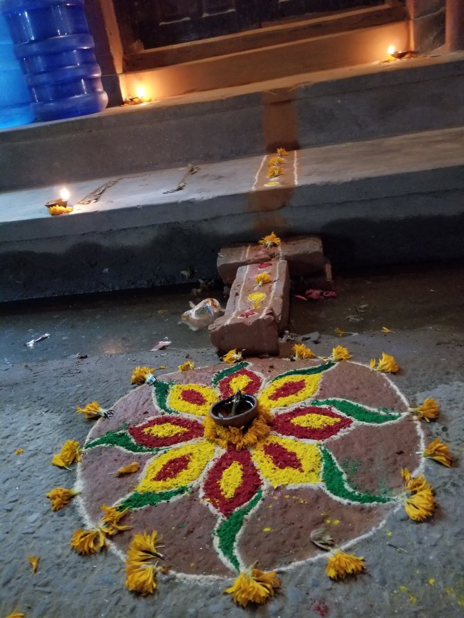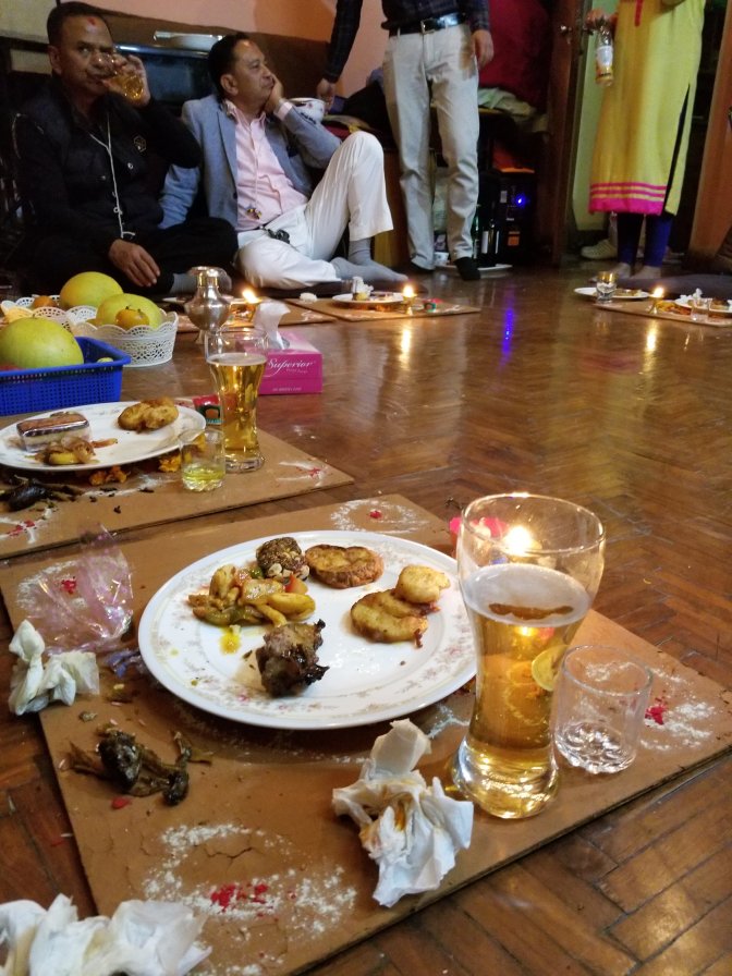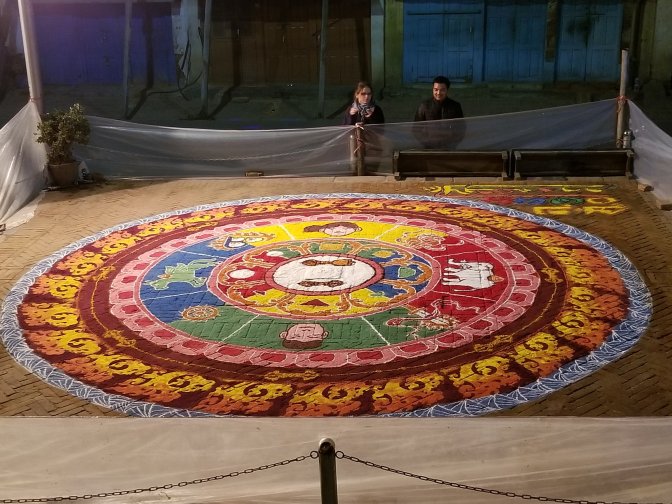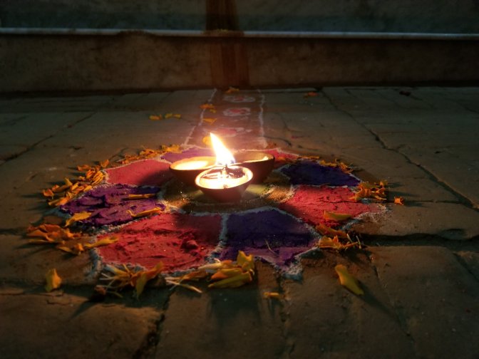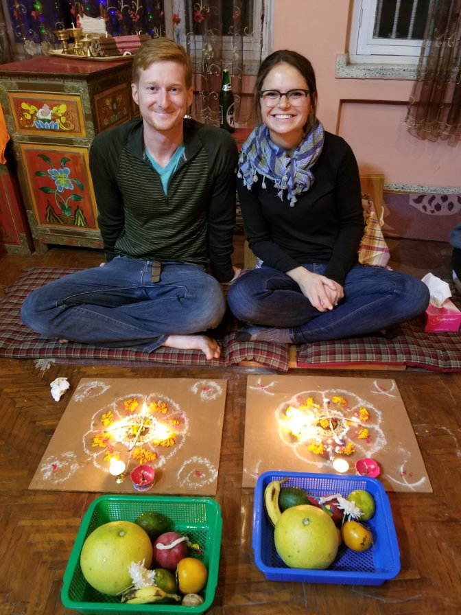 Timing appeared to work out because one of the biggest festivals of the year was about to start called Tihar. Tihar is celebrated for roughly 5 days with different themed celebrations for each of the days. Sam’s family kindly offered to include us in their celebrations, and this ended up being definitely one of the coolest things we’ve done while traveling. Every home puts up Christmas lights everywhere, and marigolds are strung from doorways of homes, businesses, and other public places. Large sand mandala art is temporarily installed around town in open spaces, while smaller versions are installed in front of the homes, including candles, flowers, and other items.