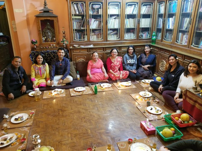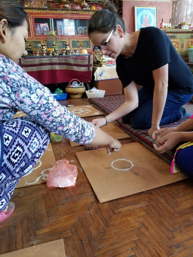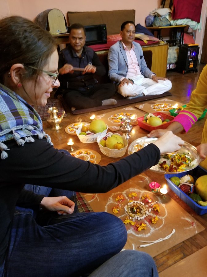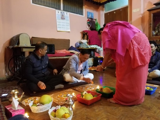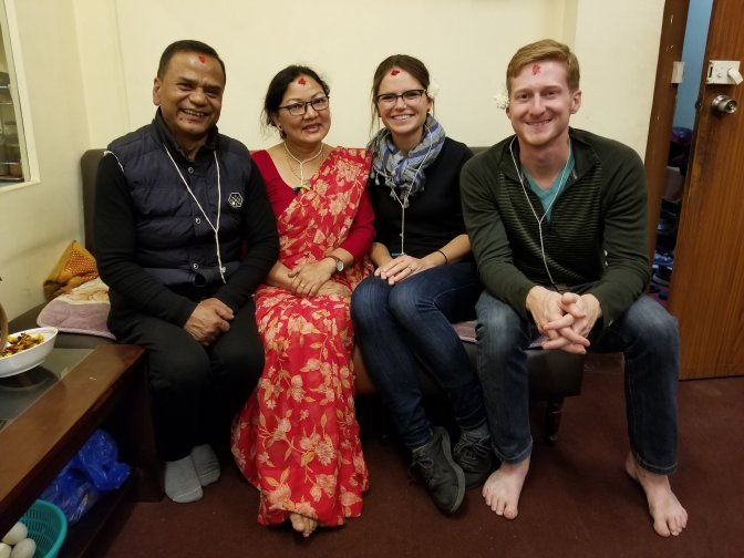 We also celebrated the next to last day with the family which focuses on celebration of the physical self and health. Sam’s family and we made mandala art, and we were offered puja blessings by his grandmother. We also ate some really tasty food prepared by his mother and sister. It was a really cool experience. We also learned I should practice sitting cross-legged on the floor. Haha. Thanks for letting me use the back support in the meantime though! : P